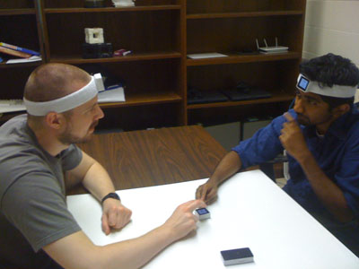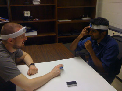 So I created Mind Reader, which is a game where you wear a Sifteo cube on your forehead using a headband. This forces you to look your opponent in the face throughout the game.